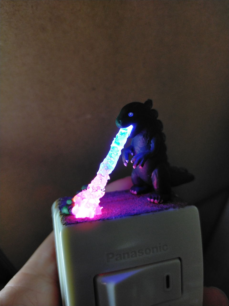 スイッチを押すと怪獣の吐き出す炎が光ります。