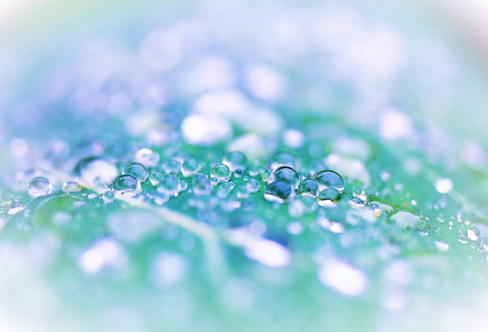 新緑の若葉の上では小さな水滴が初々しく小さな水宇宙