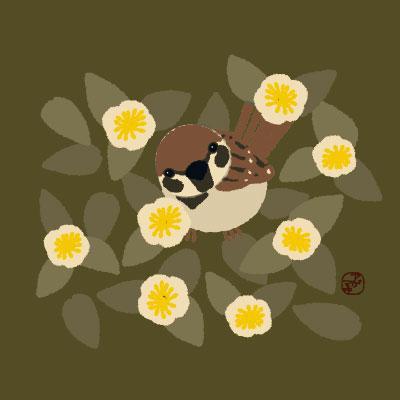小林一茶の「茶の花に隠れんぼする雀かな」という句をもとに描きました。