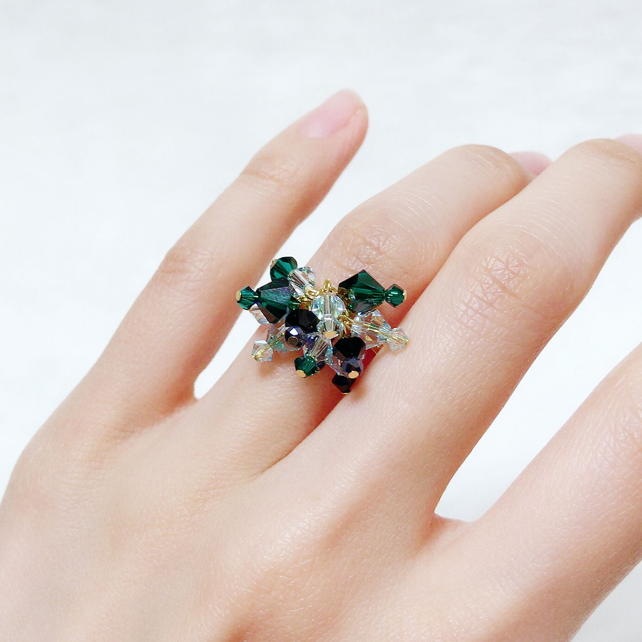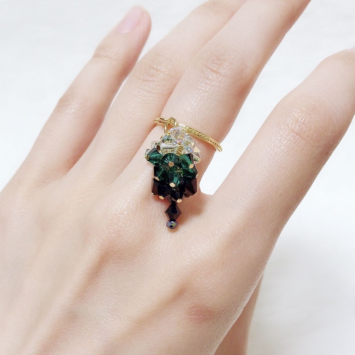 極彩色のスワロフスキークリスタルでつくるビーズタッセルシリーズです。タッセルは“房・束”とゆう意味で“豊穣・豊かな実り”のモチーフです。四季の美しい色彩のインスピレーションから、ジュエリー職人経験を活かして一つ一つ丁寧に加工しています。沢山のハイジュエリーに出会う中で、今現在の私の日常に落とし込める「うっとりするもの」を作りたいとゆう想いから始まりました。ビーズタッセルは下げたときになるべく内側の細工がみえないようにパーツを小さくしています。色彩の組み合わせや配置によって変わる印象とともに、「手元の華やかさが目に入った時にパッと気持ちが明るくなる」ようなシーンを贈りたいです。お好みのビーズタッセルとリングサイズをお選びいただけます。