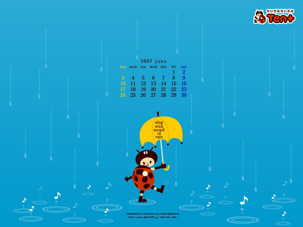 改/【'07年6月カレンダー付】■title『 雨のリズム 』:一緒に歌えば雨の日もご機嫌だもんね♪/■size:1024×768/■msg:テントウ君の壁紙です。いつもDLしていただきありがとうございます。6月も是非お使いください☆