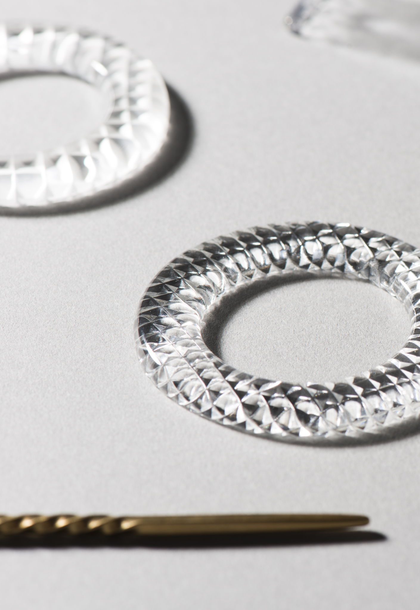 江戸切子の職人が、ひとつひとつ丁寧に手作業でカッティングを施したガラスのかんざしは、 晴れた冬の日の水面に張った氷のように、キラキラと輝く。 さっとつけた瞬間から、エレガントな光をまとうかんざし。 昔から女性たちに好まれた文様を江戸切子で表現し、 素材には、切子誕生当初からの素材である透きガラスを使用し、太陽、月、水平線をモチーフに3タイプのデザインで展開。クラフト感を引き立てつつ現代的なイメージを表現するため、ミニマルなデザインに仕上げた。