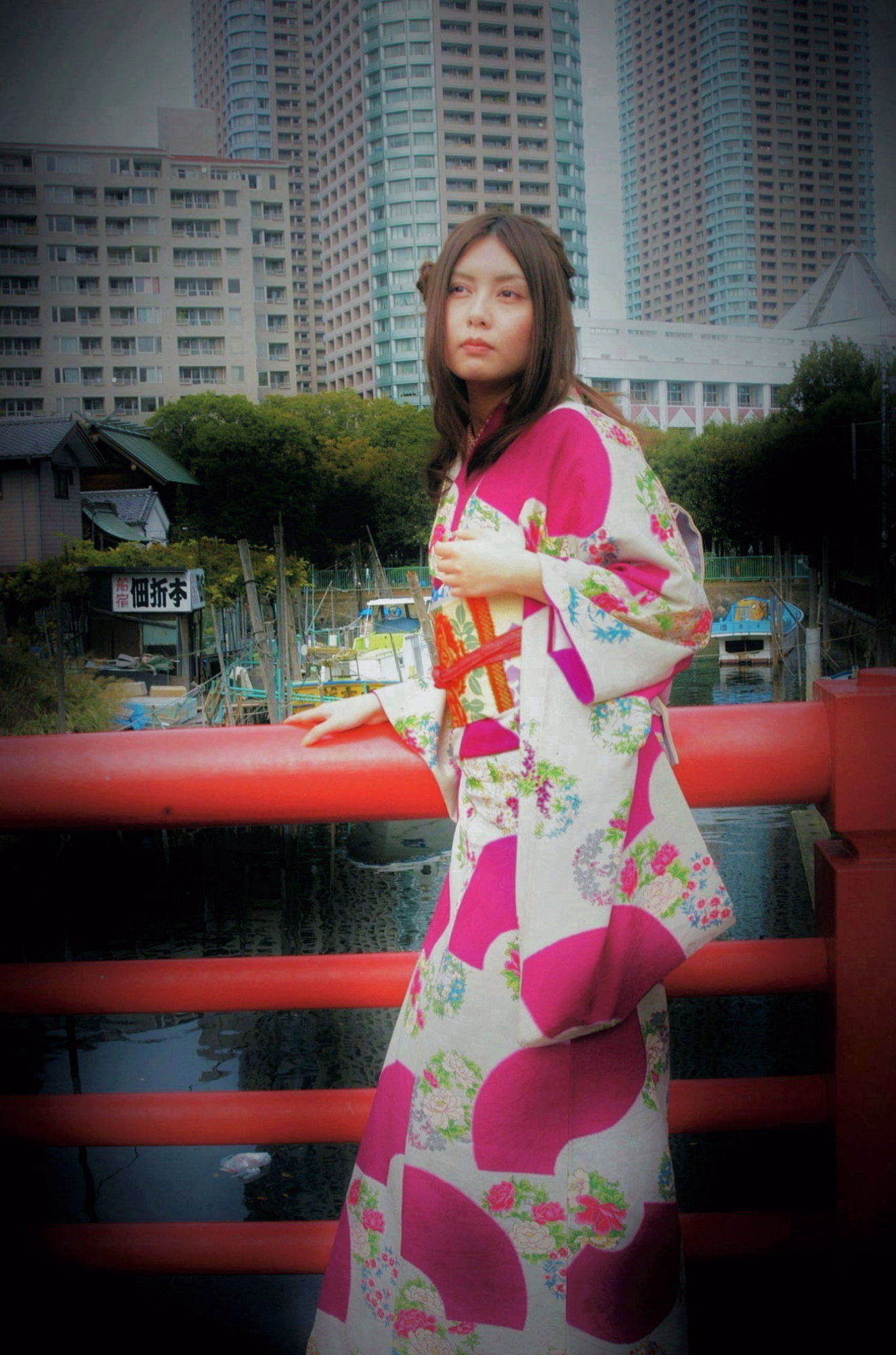 The bridge where down town Tsukishima in Tokyo is red for this picture