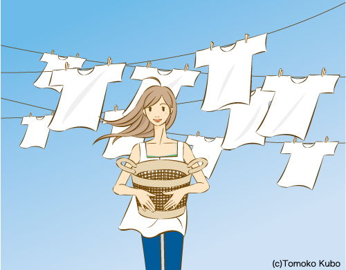 屋上で洗濯物を干し終わって、スッキリしたイメージで描きました。