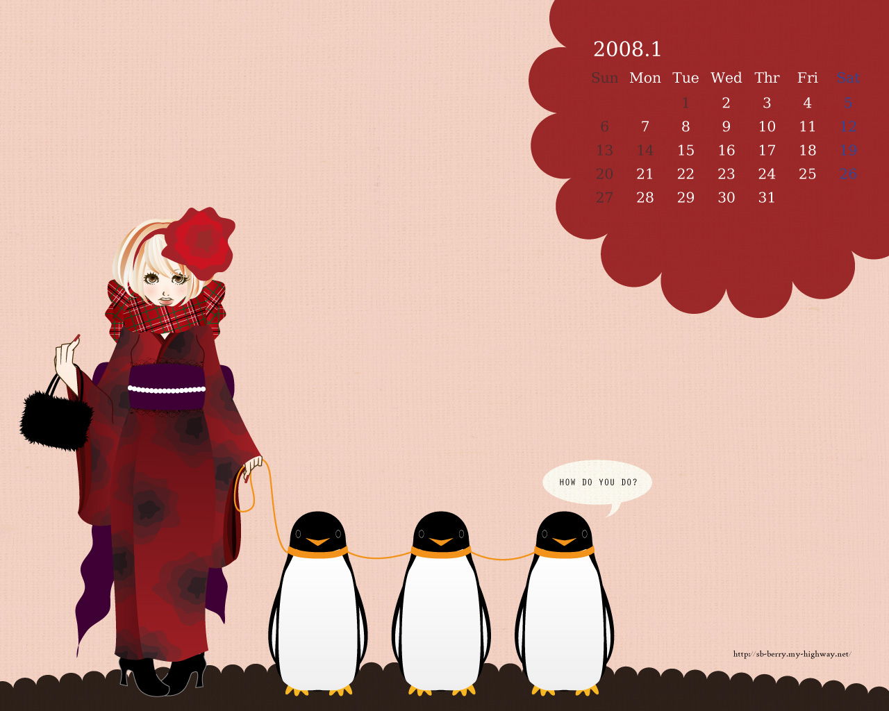 ペンギンと着物 1月カレンダー