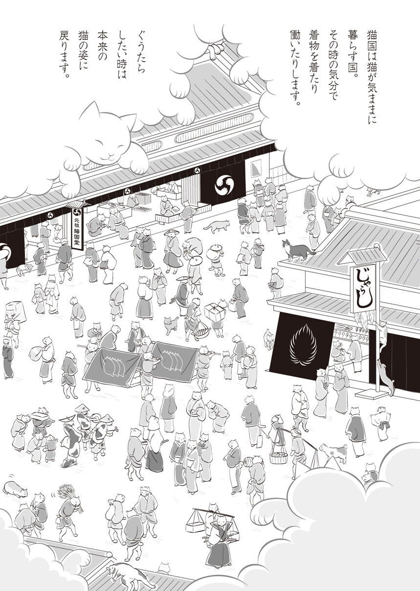 2017に角川書店から発売された初の著書です。「猫国よもやま お菓子ばなし」の舞台は猫国(にゃんごく)。猫が気ままに暮らす国です。その時の気分で着物を着て働いたり、元の姿のままぐうたらしたりします。お江戸に似てますがお江戸にあらず。そんな猫の国のお菓子やお菓子にまつわる話を集めた絵草紙のようなコミックエッセイです。