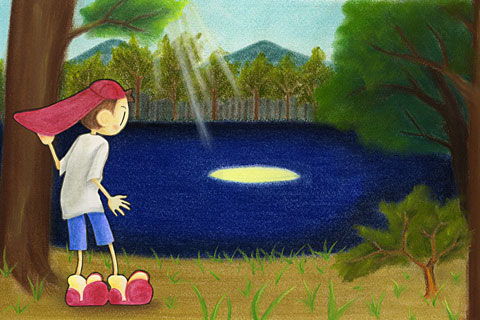 太陽は真上に昇っているのに、水面には大きな満月が映っています。