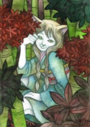 オリジナル アナログ イラスト 創作 動物 擬人化 水彩 化け物 妖怪 美少女猫