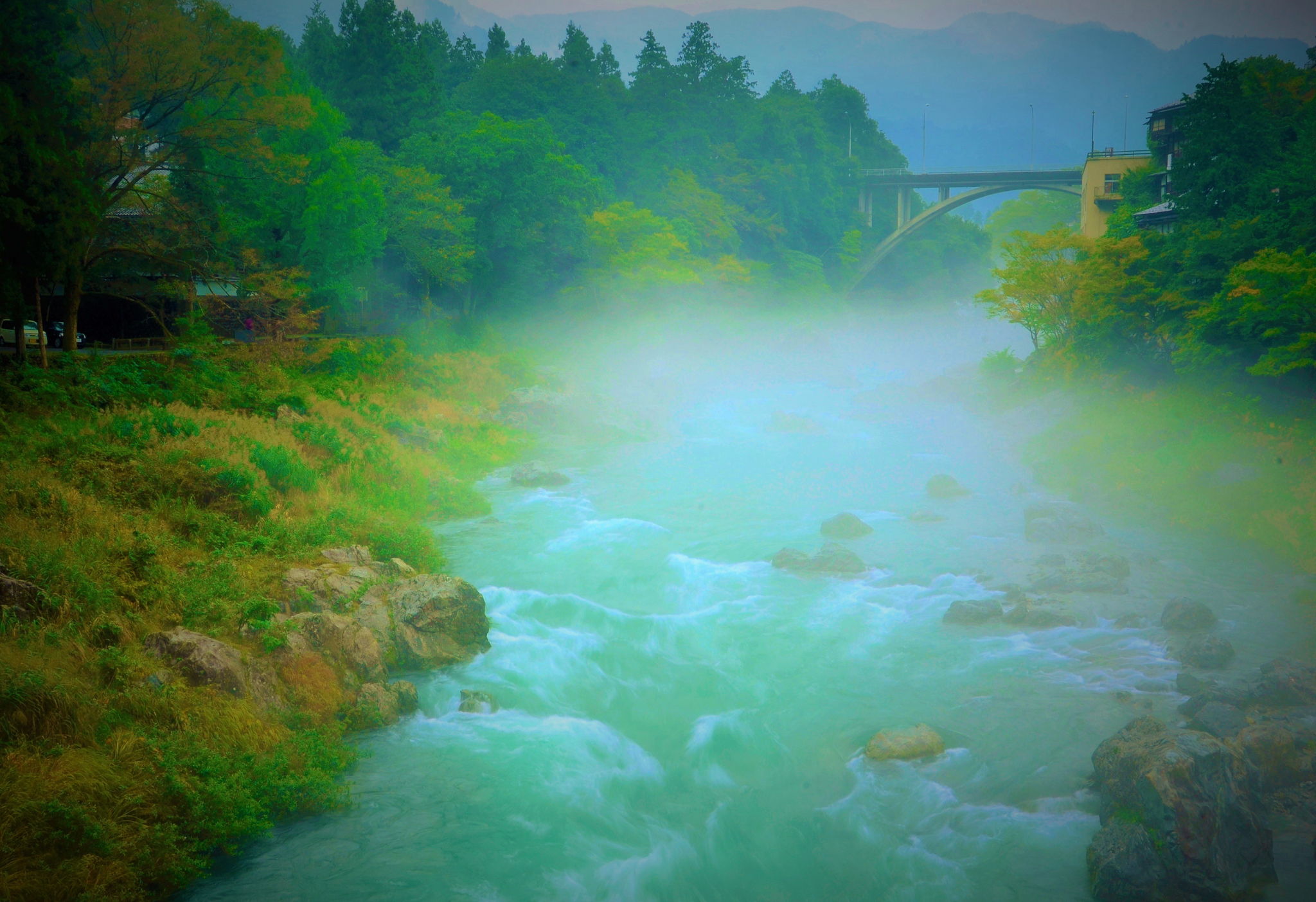 予期したように渓谷一帯は珍しい朝の靄に包まれ夢幻的な光景を