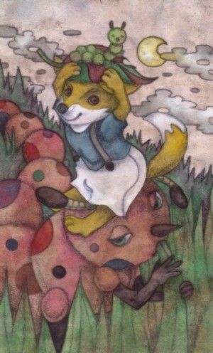 original analog illustration fairy tale watercolors animal caterpillar fox personification
