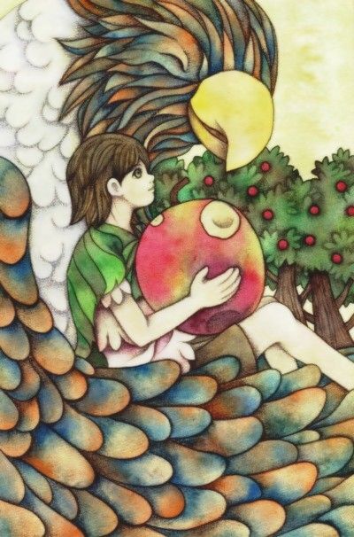 オリジナル アナログ イラスト メルヘン 水彩 男の子 少年 鳥 林檎