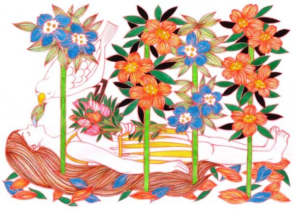 original analog illustration design flower woman watercolors dead body copy paper plant