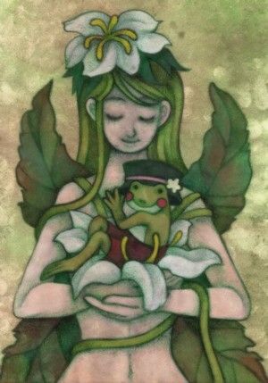 オリジナル アナログ イラスト 女性 少女 水彩 女の子 植物 妖精 蛙