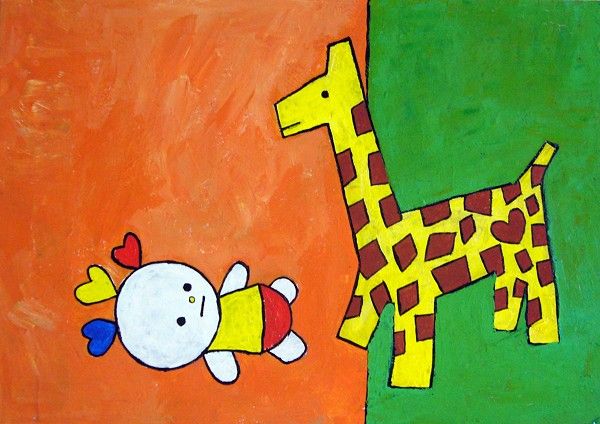 この絵は、生まれたばかりのポレオがキリンと出会うシーンです。