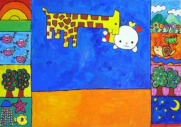 この絵は、生まれたばかりのポレオがキリンと出会うシーンです。