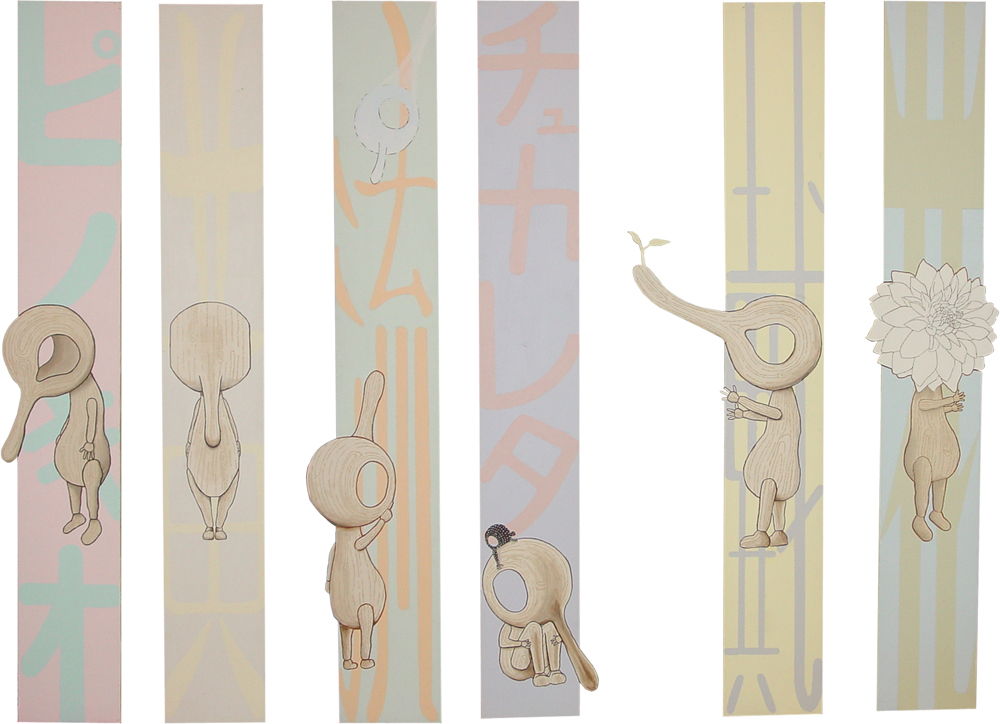 合計11枚の縦長な木の板に、ピノキオをパロディー化したストーリーを描き絵本として展示した作品。