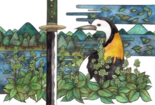 アナログ イラスト 創作 水彩 動物 植物 刀 鳥 蓮角 沼