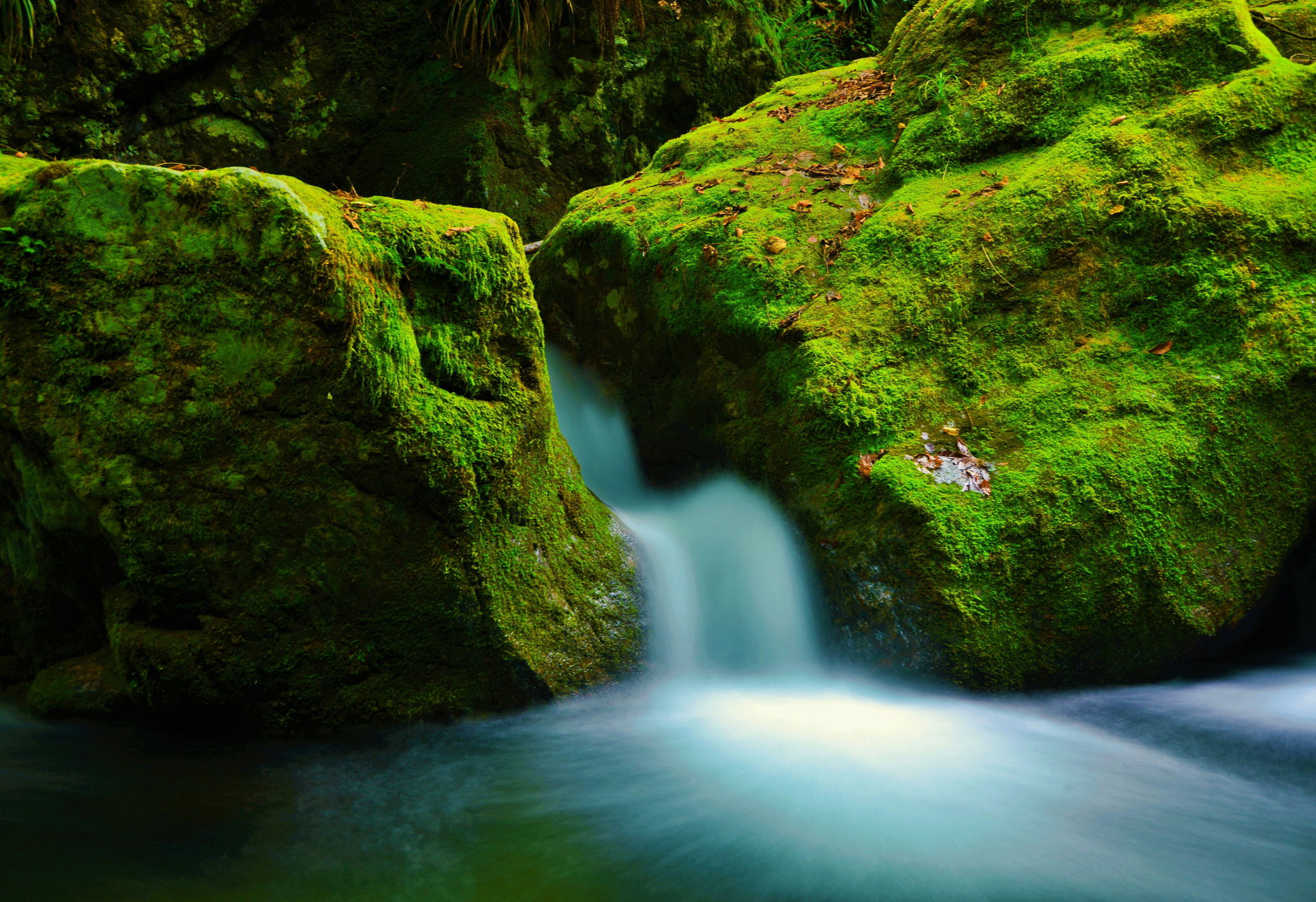 大きな苔の岩に挟まれた清涼な小さな水の流れ