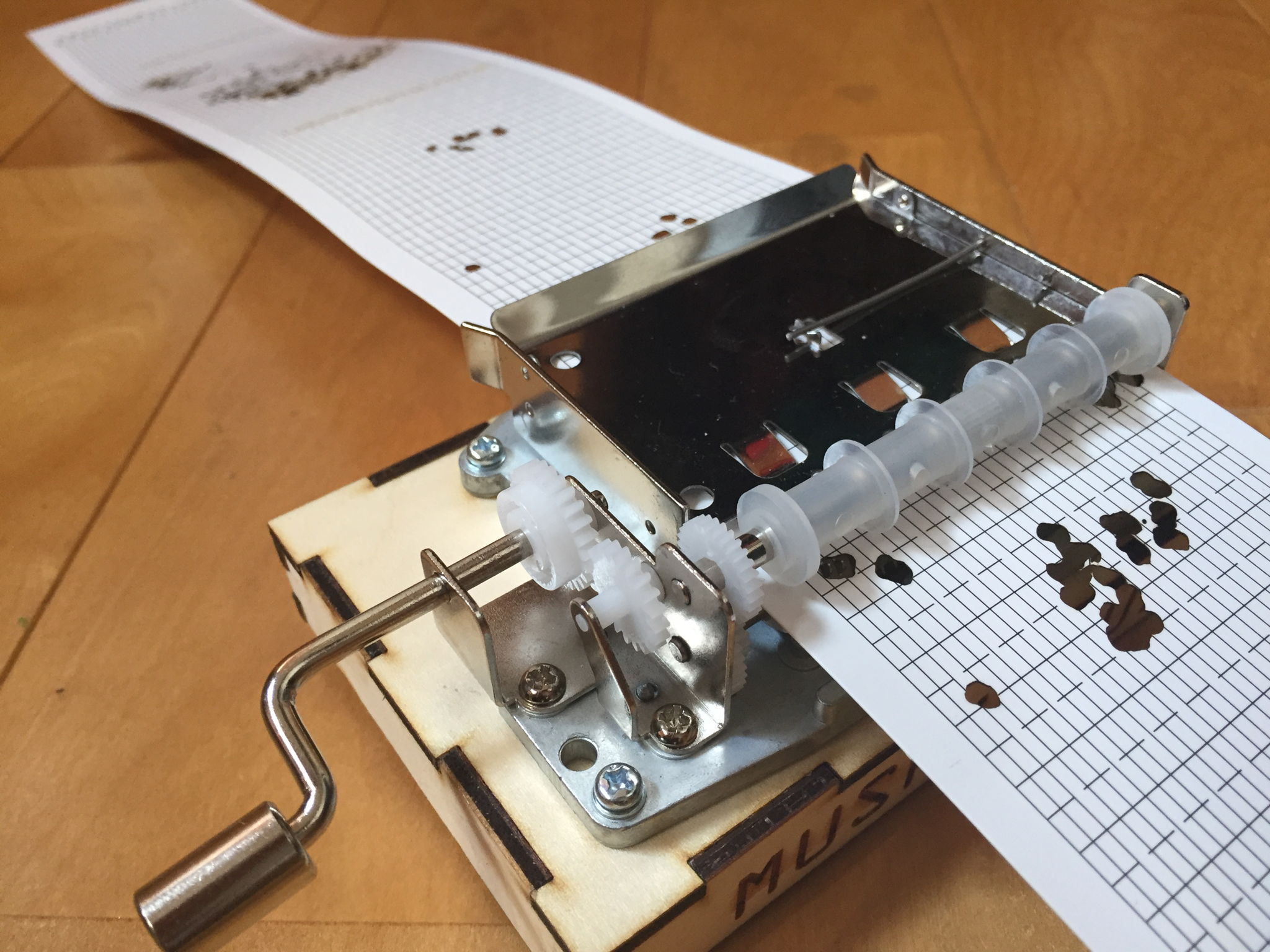 虫たちの営みの跡が残る虫喰いの跡を見かけることがあるだろう。そこにはどんな営みがあったのだろうか。そんな虫たちの営みを取り出した時、果たして音楽として奏でられるのだろうか。このパンチカード 式のオルゴールの穴は、虫たちの営みから抽出されている。そこにはどんな音が生まれているだろうか。