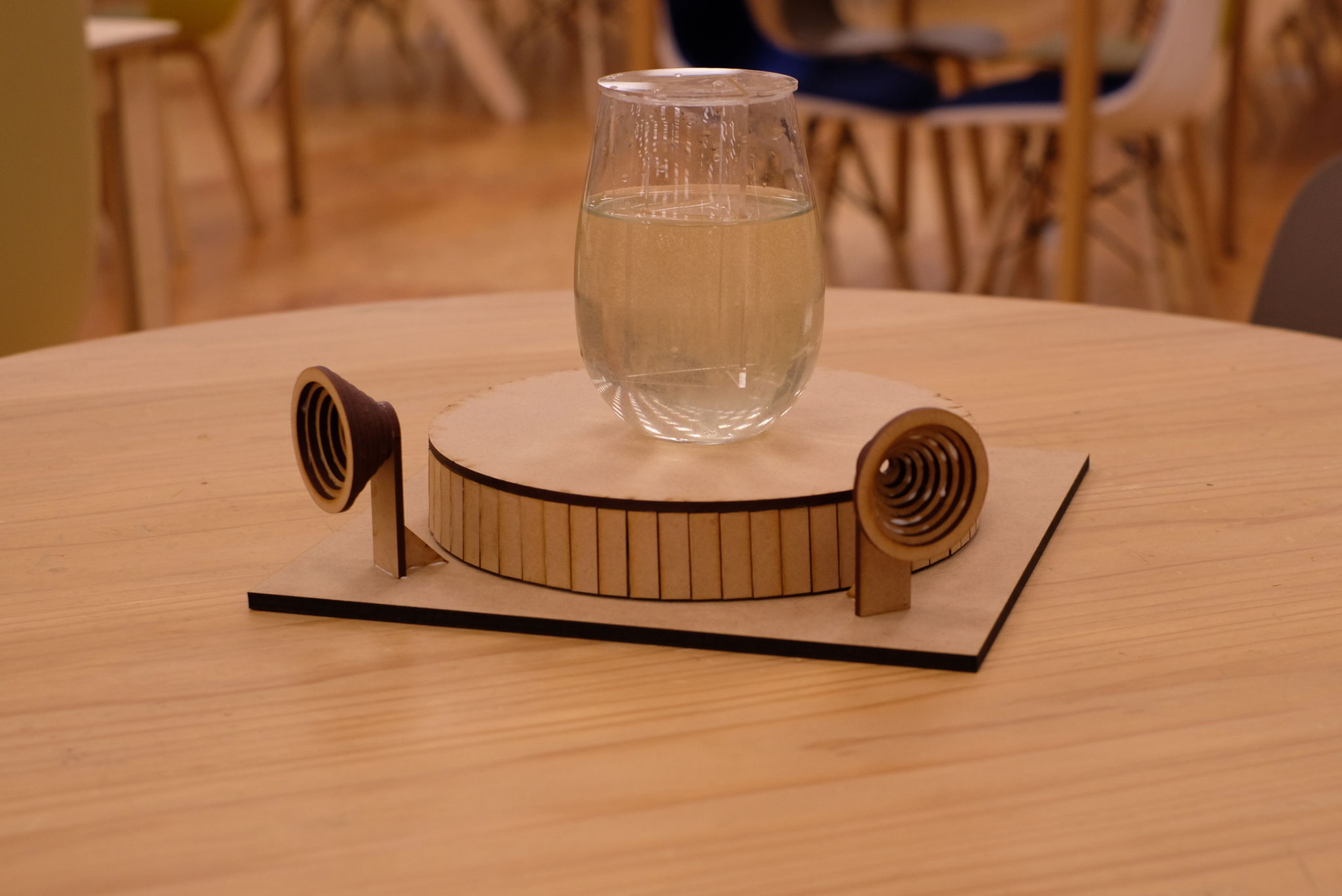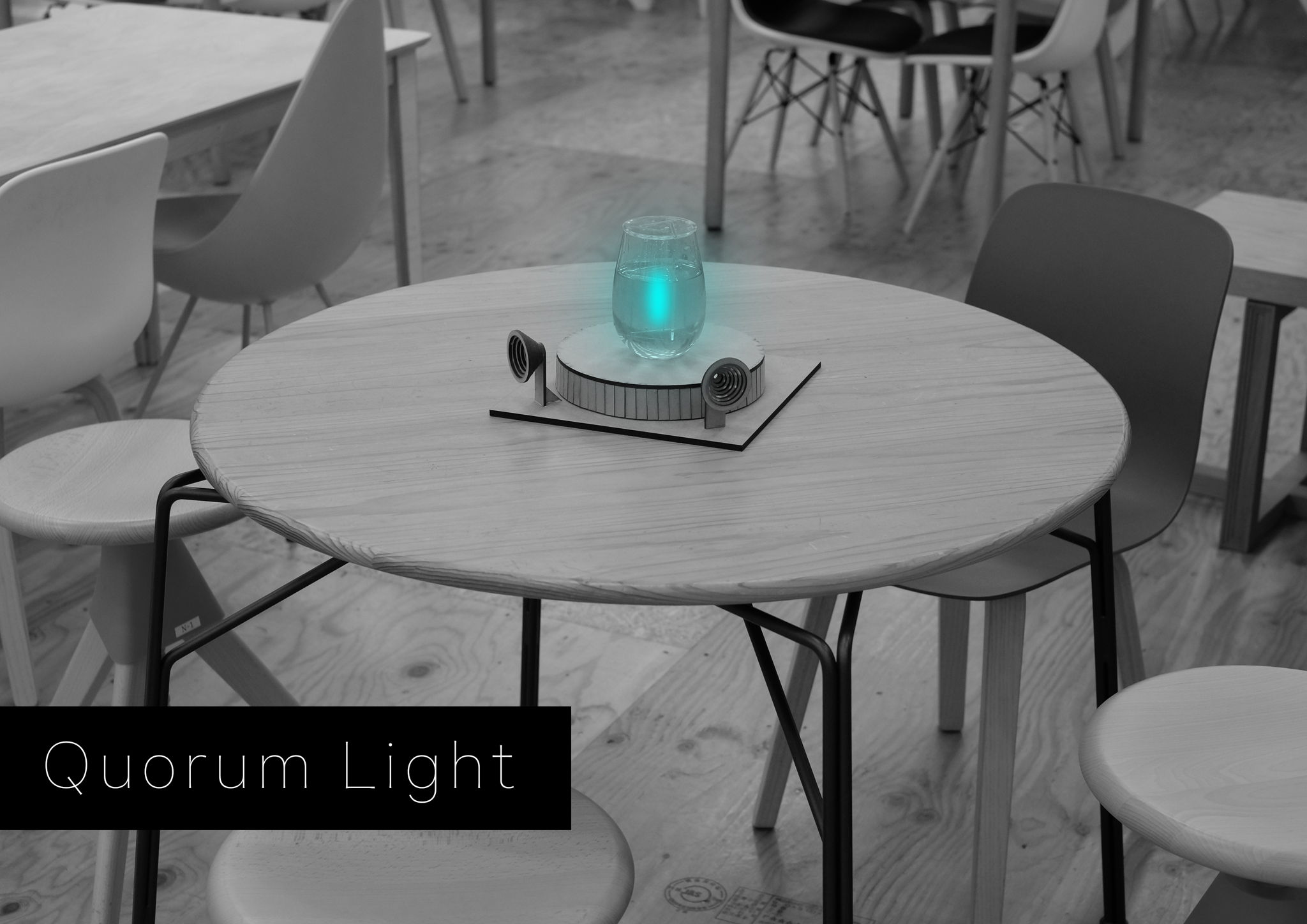 クオラムライトは、人のコミュニケーションを可視化するライティングシステムです。Vibrio Fischeriという、細胞密度が高くなると光る細菌を用います。細菌が入った器を回転させ、中心に細菌を集めて密度があがることにより光る構造となっています。展示空間にて来場者のコミュニケーション量が増えると、器が回転して光ります。一方で、コミュニケーションがなくなると、器の回転が止まって光が消えます。細菌が発する美しい光によって、人々のコミュニケーションが活性化したり、細菌世界と人間世界の共鳴の体験を得ることができます。