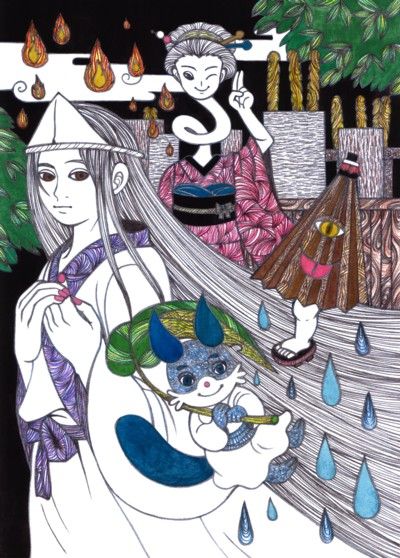 オリジナル アナログ イラスト ドローイング お化け 幽霊 妖怪 唐傘お化け 轆轤首 墓場