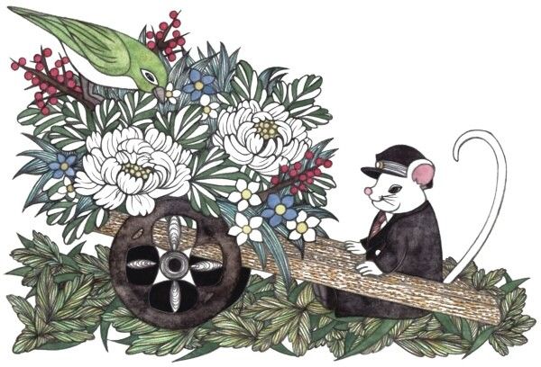 ネズミ ウグイス オリジナル アナログ イラスト ドローイング 花車 動物 植物 2008年子年年賀状用デザイン