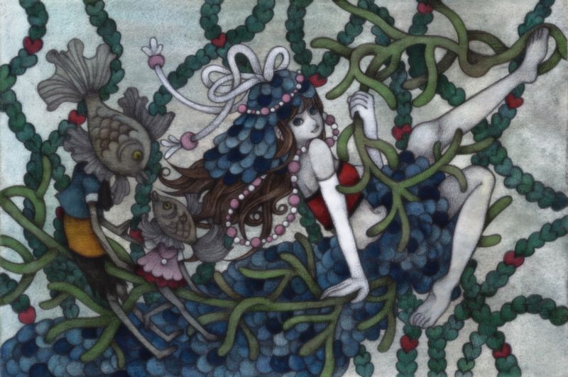 オリジナル アナログ イラスト メルヘン 少女 水彩 擬人化 水中 魚人