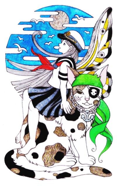 オリジナル アナログ ドローイング メルヘン 少女 女の子 猫 キャラクターイラスト セーラー服 水彩 original analog drawing fairytale girl cat character illustration sailor watercolors