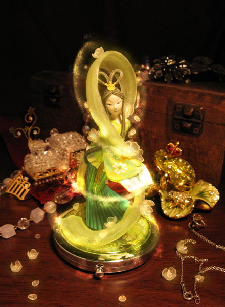 人形は石粉粘土ですが、周りの花、羽衣などは透明樹脂粘土で出来ています。