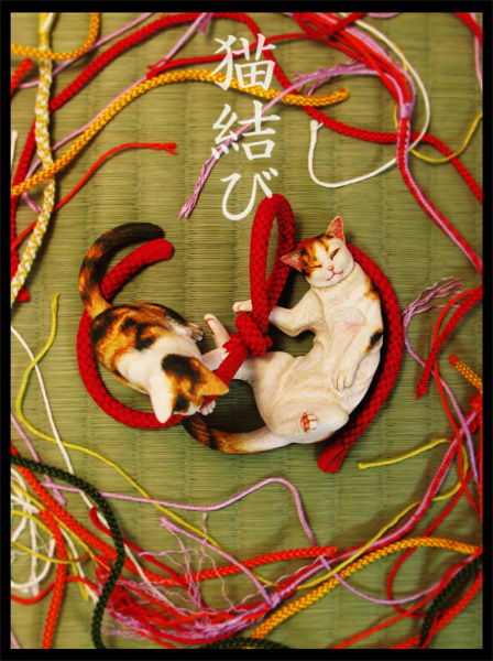組紐屋に住んでいる2匹の三毛猫・・という設定です。毎日紐で遊んでいるうちに結べるようになってしまったとかなんとか^^