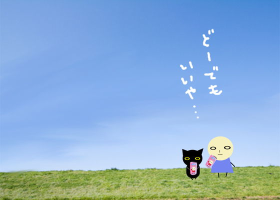 ゆるキャラ、どーでもくんと黒猫ポチ。