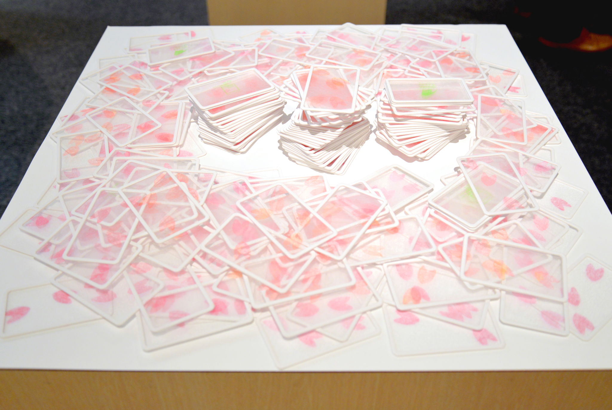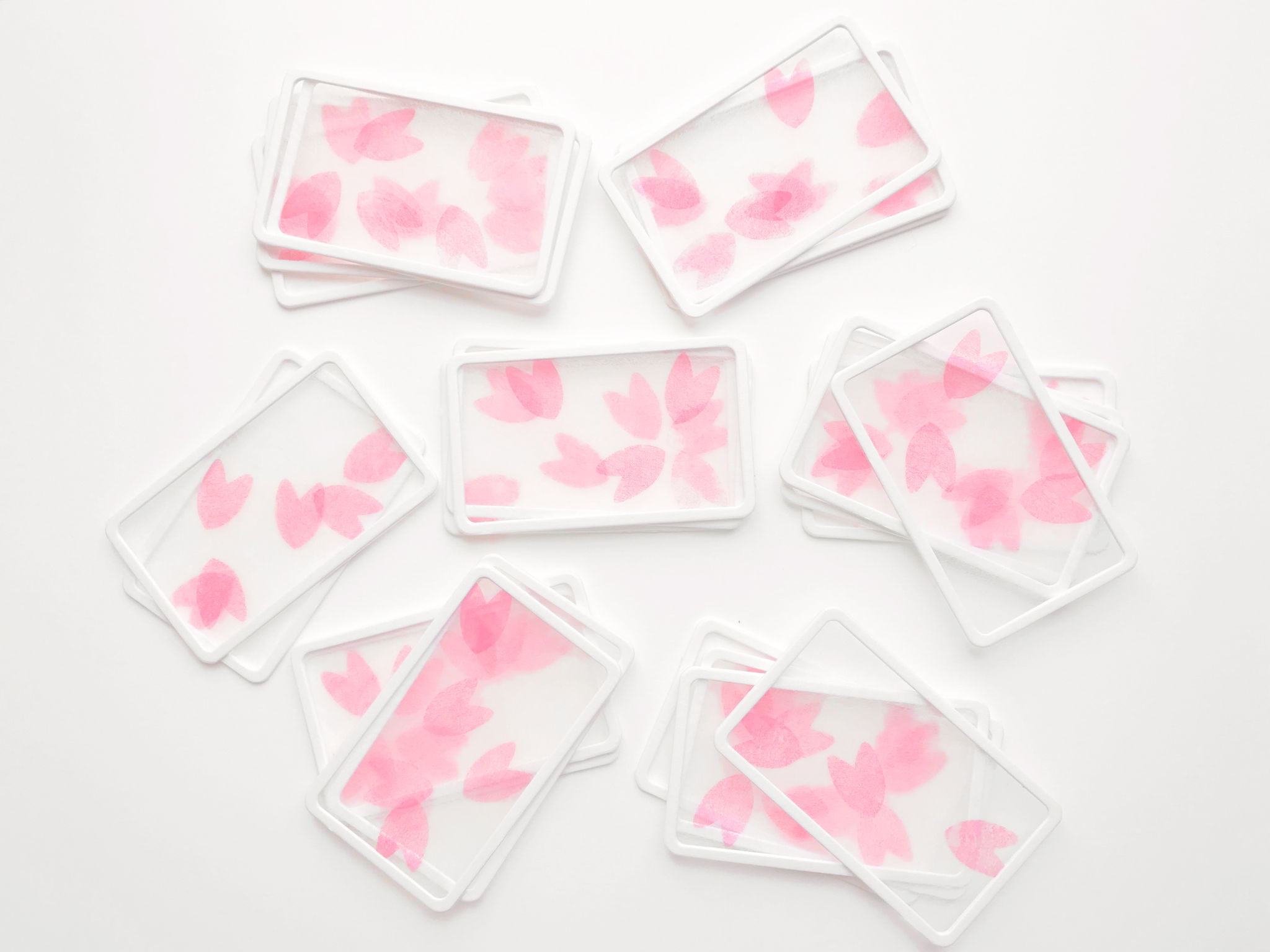 作品画像はサクラが舞い散る風景を薄い紙と印刷のレイヤーで表現しました。季節や場面にあわせて印刷するモチーフやフレームの色を変えて拡張していきます。