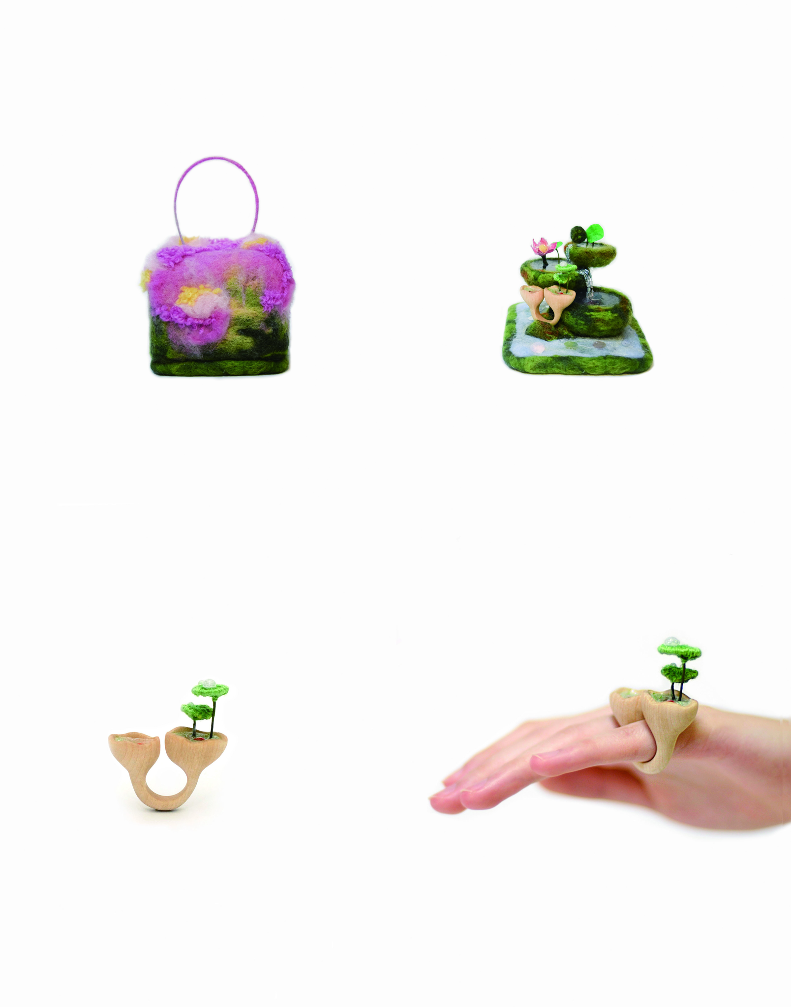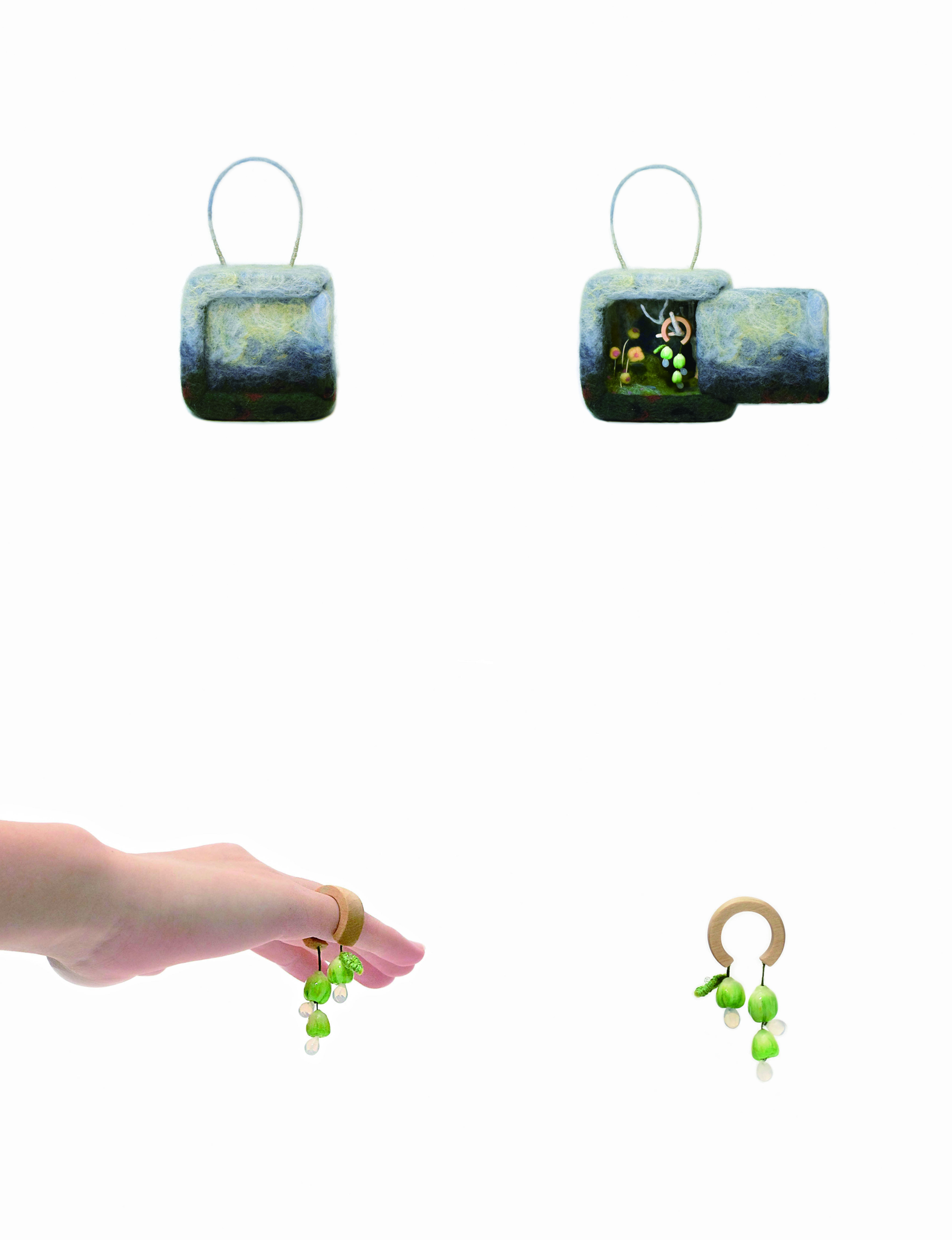 バッグの本体には暖かさが感じられるフェルトを使う。石けん水につけたフェルトからは中国の水墨画のような美しい風合いが感じられる。その風合いを活かしながら、季節の変化により、十二個の指輪とバッグの組み合わせが出来上がった。自分の思い描いた世界観・心の色をバッグを開いた瞬間に、空間として展開した。