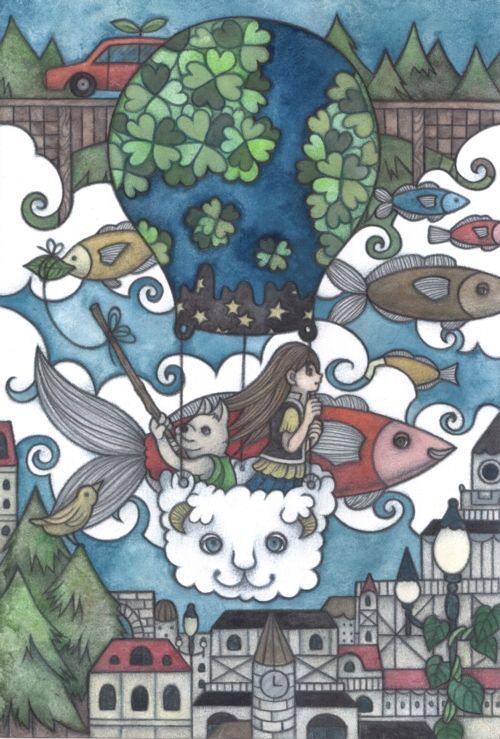 オリジナル アナログ イラスト メルヘン 少女 女の子 水彩 動物 釣り 気球