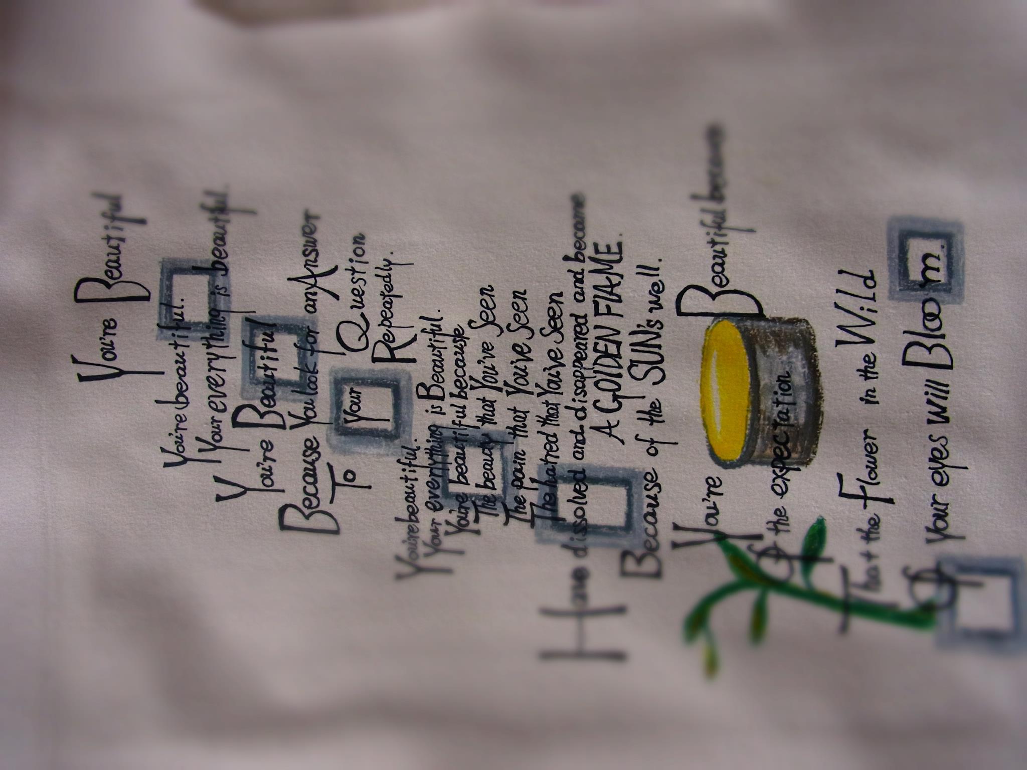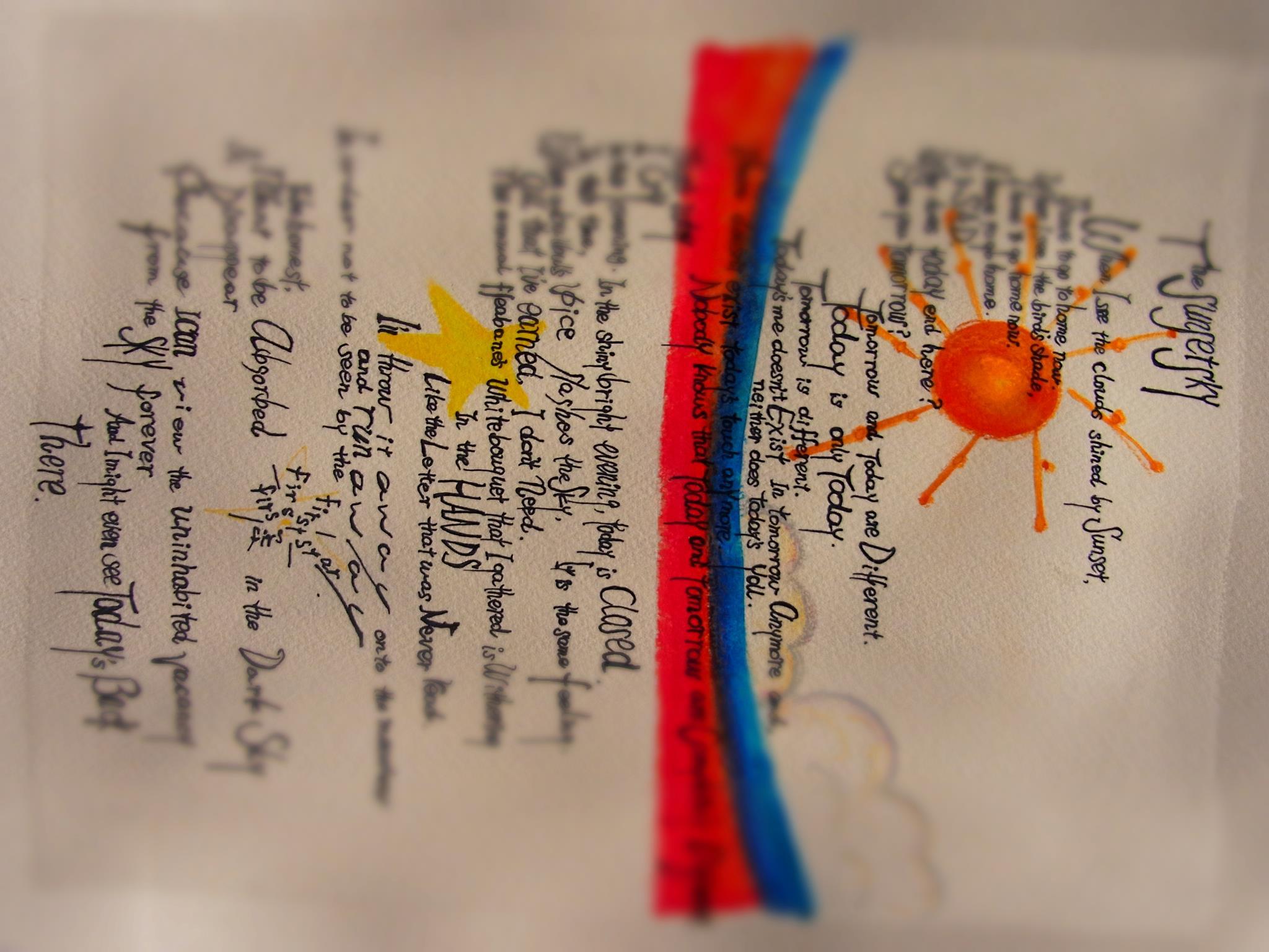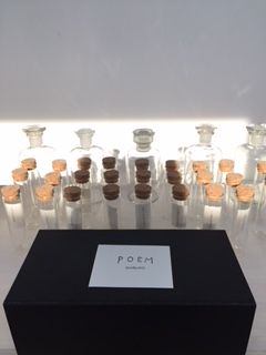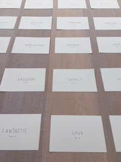 それらが一堂に咲いている様子を眺める作品。感情が自分の外側にある様子を眺める。床には感情の描かれた20枚のカード。その向こうに20種類の感情の短詩が入った60本の瓶が並ぶ。