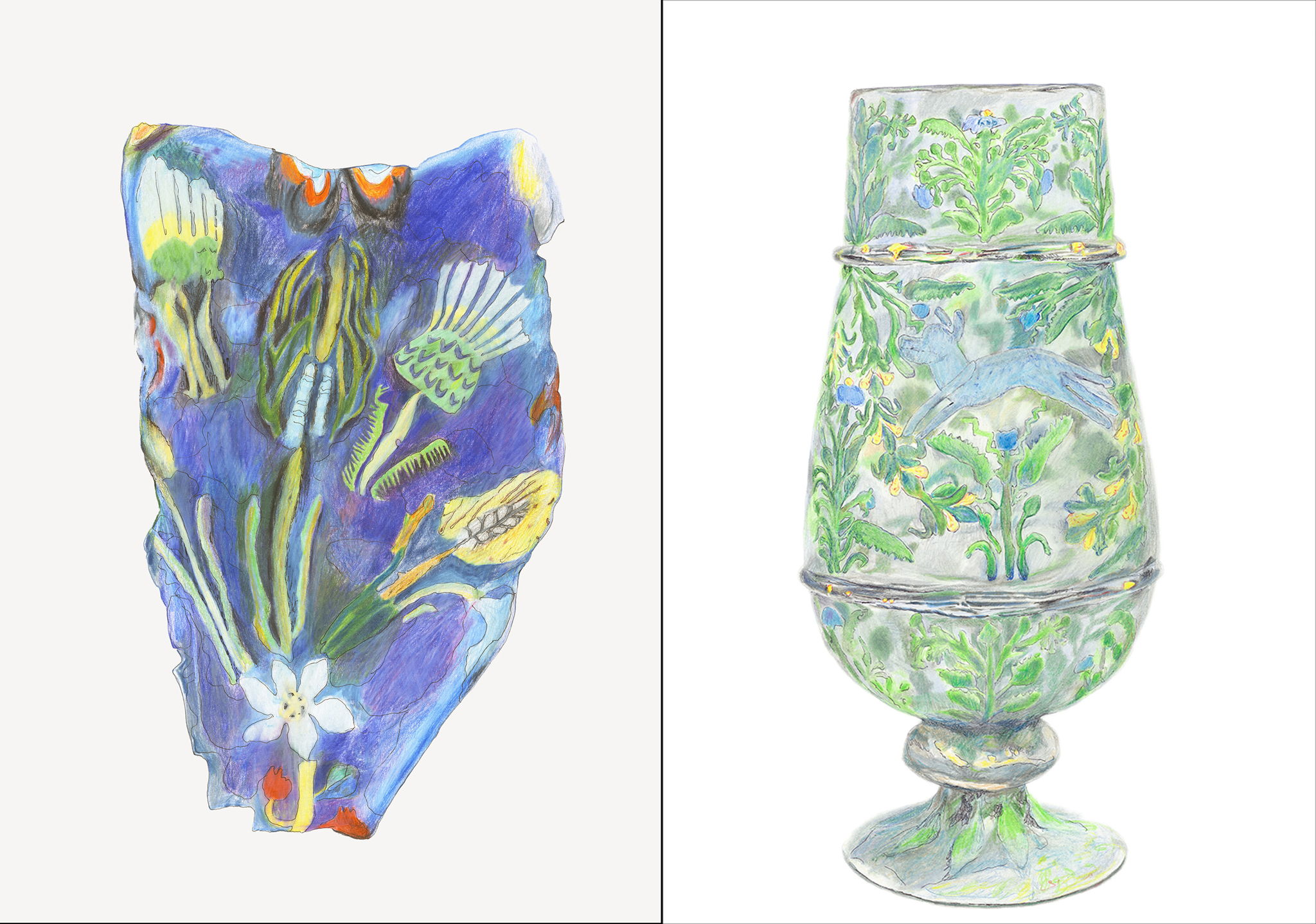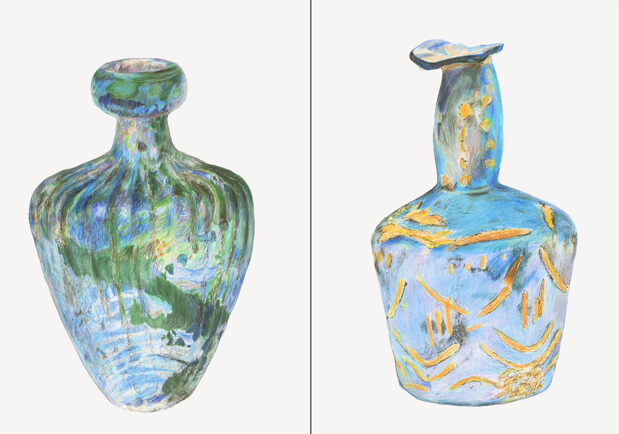 このシリーズでモチーフとして選んでいるのは、透明な器や、柔らかな土からできた土器、ちらばったガラスの破片です。これらは全て、かつて容れ物としてなにかを受け止める機能を持っていたものです。