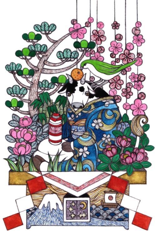 original analog illustration drawing For New Year's card animal plant surreal cow