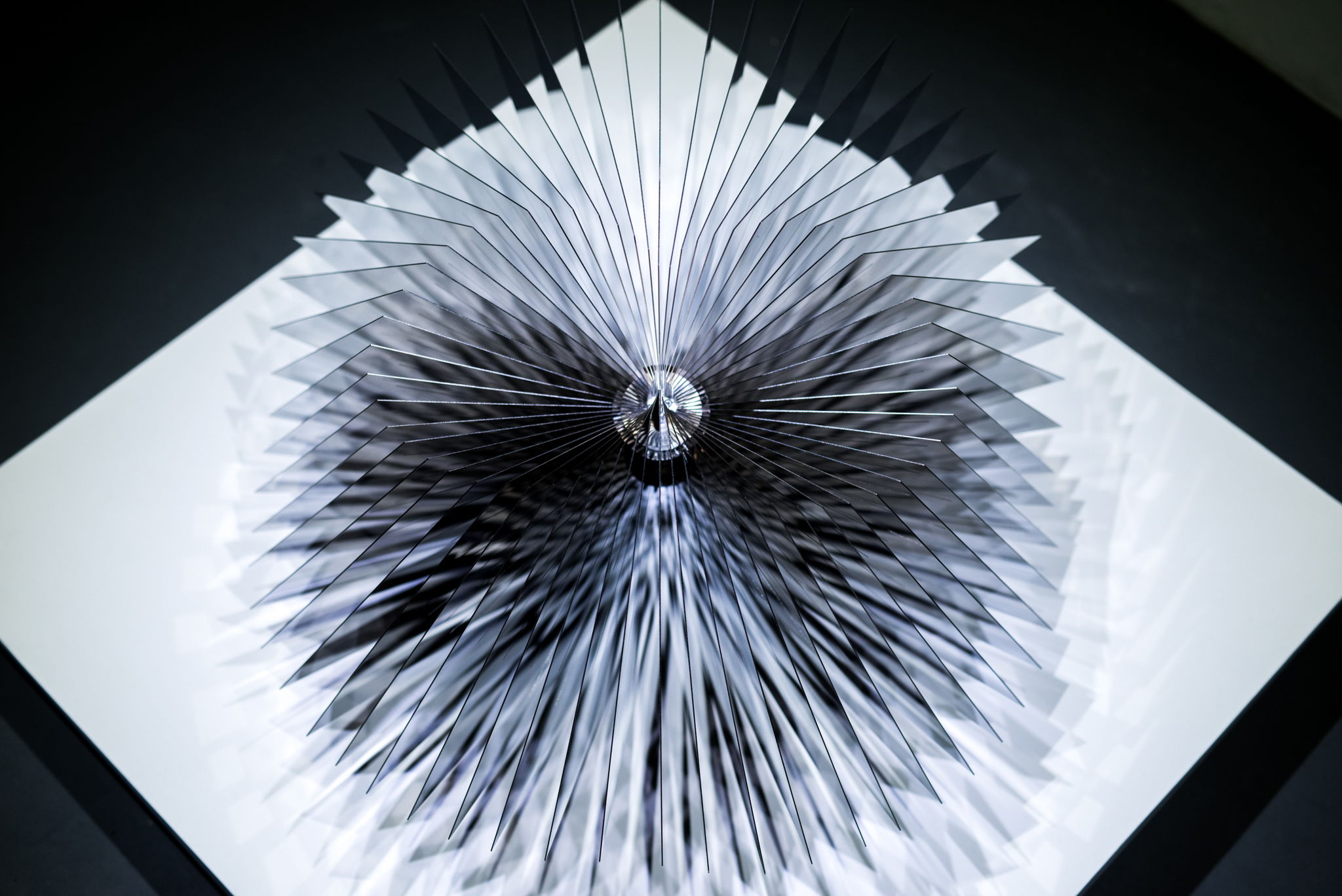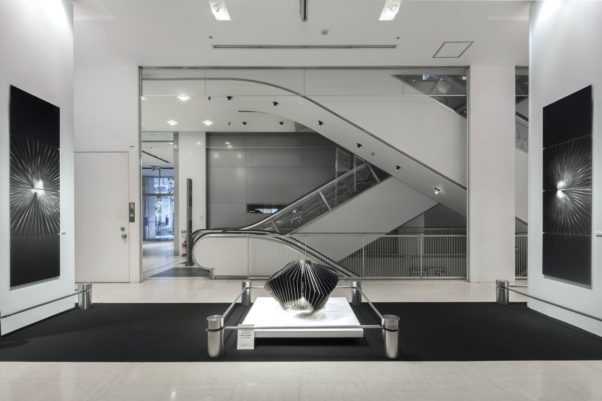 立体の持つ素材の堅さが変容し有機的な、何か別の生き物のようにも見える。アクリルに映り込む周囲の環境を泳ぐように成長していくようでもある。ある出来事が関係し合い新たな出来事を生む。それがまた次の事へと続く。これら出来事の連続が、互いが互いを成すための、またこの世界という出来事を構成する大切な一部となるのである。