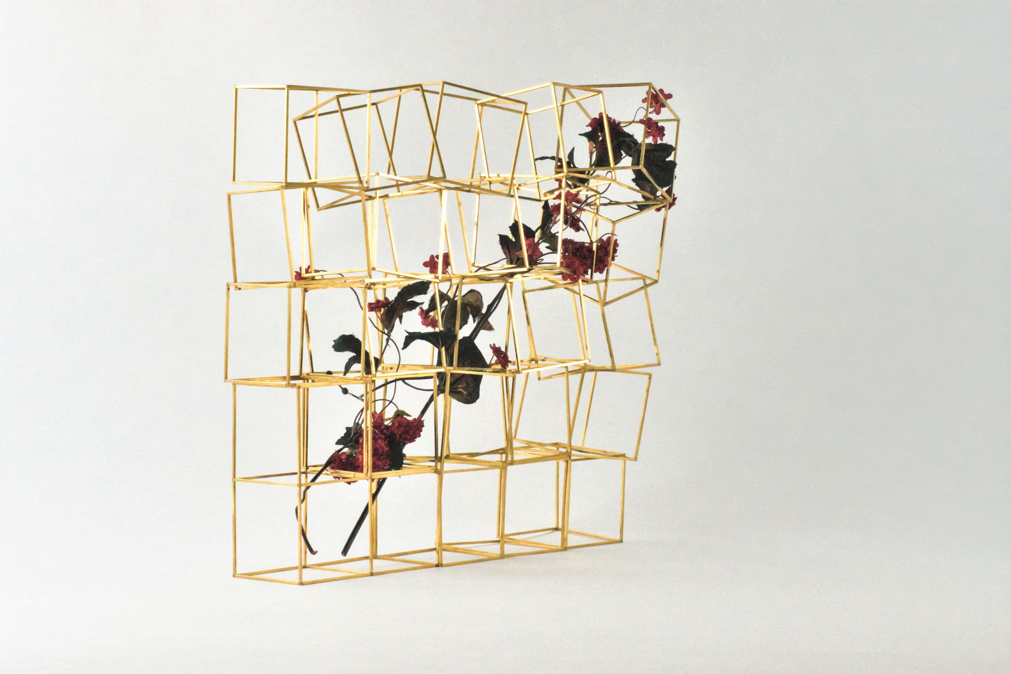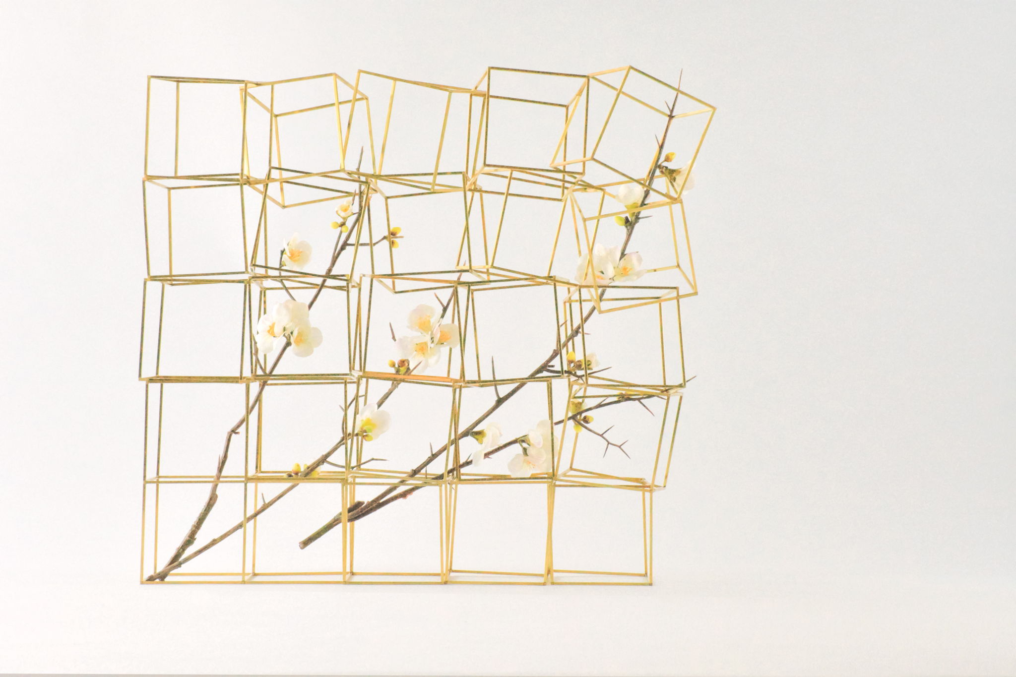 Cubeの中に植物を活けることで、Cubeの群れが演出する生命感との相乗効果を演出している。