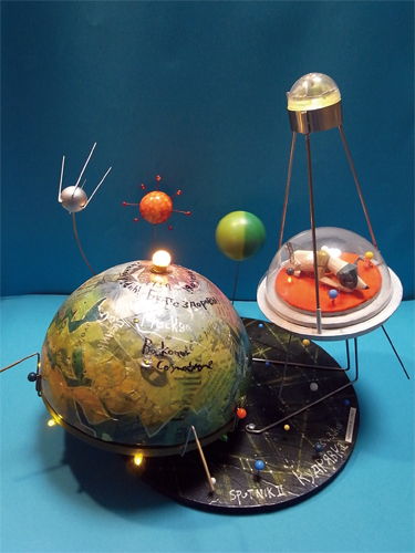 地球、月、太陽。世界初の人工衛星スプートニク1号とライカのスプートニク2号。