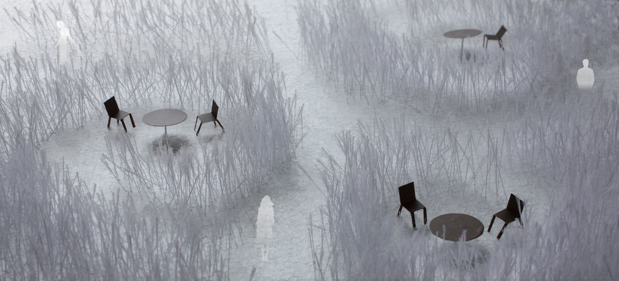 廃棄物として収集されたガラスやビンをグラスファイバーに再生し、都市の様々なパブリックスペースに植栽する。透明な繊維の重なりは均質的な空間にやわらかな疎密を生み出し、都市にガラス質の野原が広がってゆく。