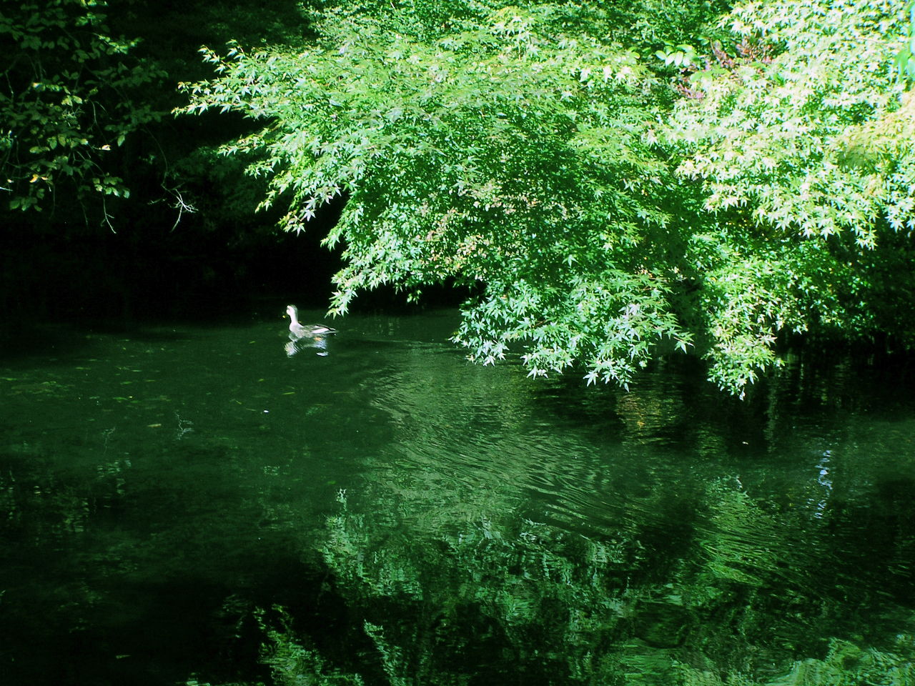 鴨(?)と水面に落ちるモミジの影。和心たっぷりですな