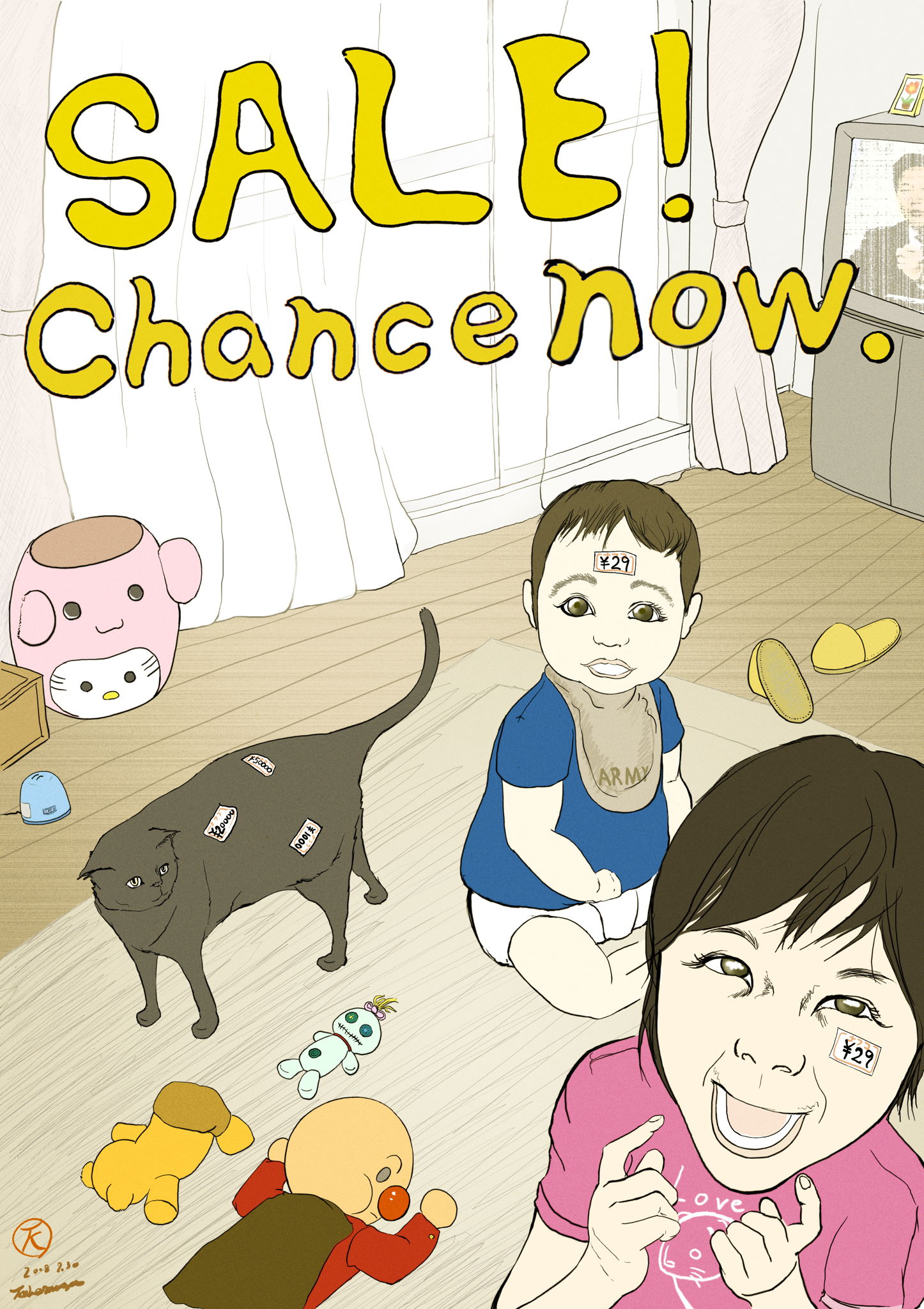 大人では考えもつかない事をやってしまったり、思いっきり子供だったりする不思議な存在。このイラストではスーパーの値札を親に貼られてはしゃいでる子たちです。