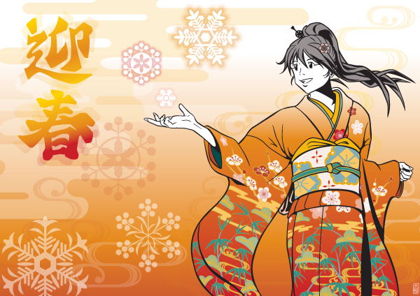 年賀状用イラストとして作りました。着物の絵柄を考えるのが楽しかったです。