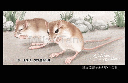 書籍の仕事で描いたイラストのひとつです。専門分野の方も手にする可能性がある書籍の仕事だったので、細かいところまで動物園でスケッチしたものを描きおこしました(写真等のトレスなし)。このタイプは仕上げまで若干時間がかかります。ラフは描きますが、ラフの通りにならなないことがほとんどです。書面に対して掲載サイズの指定通りに描かねばなりません。図鑑的なイラストは説明の必要が有ります。この動物(ねずみ)の場合は、特徴と言えるしっぽを全部いれるため、構図を考えるのに苦心しました。