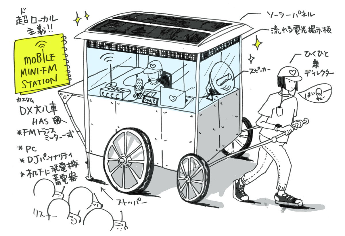様々な場面で以外に使えるかもしれない超ミニミニ放送局を人力で運べるスタイルで構成することとした。電波の届く距離は僅か100メートルであるが、その狭さゆえに、放送免許や許可が不要でどこででも(一部例外あり)、開局できるという特性がある。