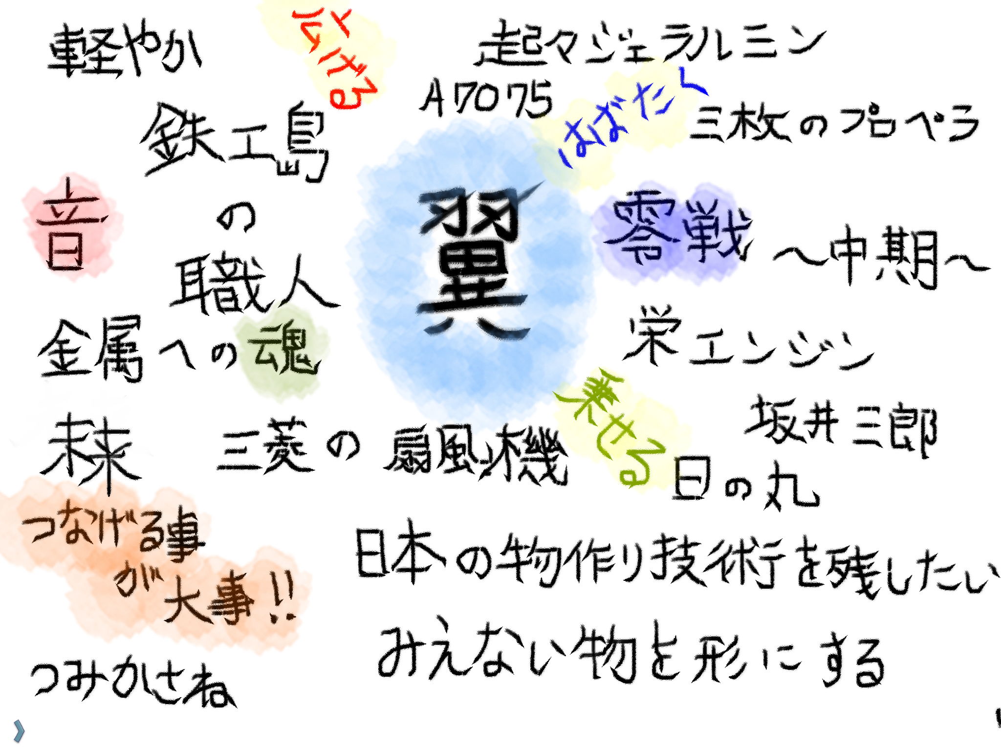 ⚫︎イメージボードに書いたように、零戦の飛行や職人さん達の魂、鉄工島の職人さん達の希望など色んなみえないものを製作した扇風機を中心に表現しのせたいことから〜翼プロジェクト〜と名づける。