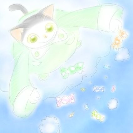 ねこのゆきが空の高い高いところ、雲の上から飴を降らせています。