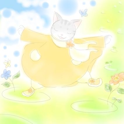 歌を歌いながら、春色の黄色いスカートをふわふわ踊らせて、猫がやって来ます。