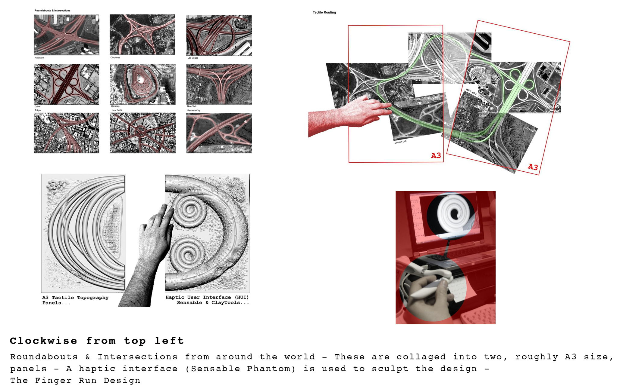 Initially inspired by studies of various roundabouts and intersections found on Google Earth, the piece explores the scaled layers of touch and the act of exploring something through the haptic sense